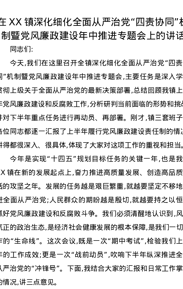 在XX镇深化细化全面从严治党“四责协同”机制暨党风廉政建设年中推进专题会上的讲话