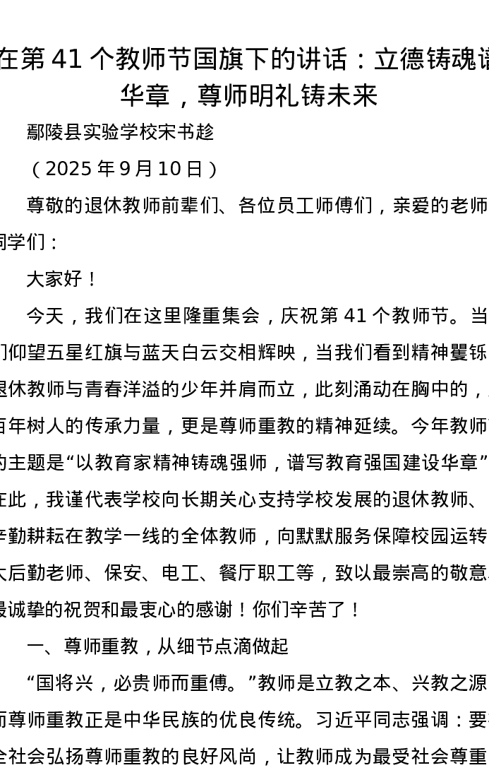 在第41个教师节国旗下的讲话:立德铸魂谱华章,尊师明礼铸未来