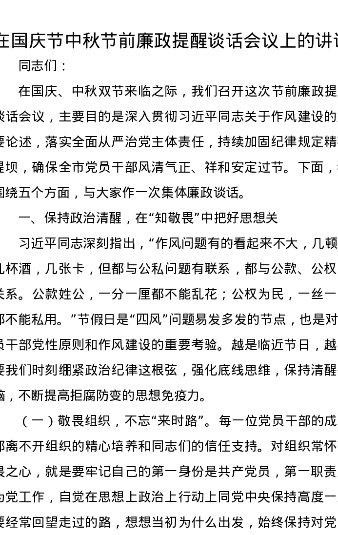 在国庆节中秋节前廉政提醒谈话会议上的讲话