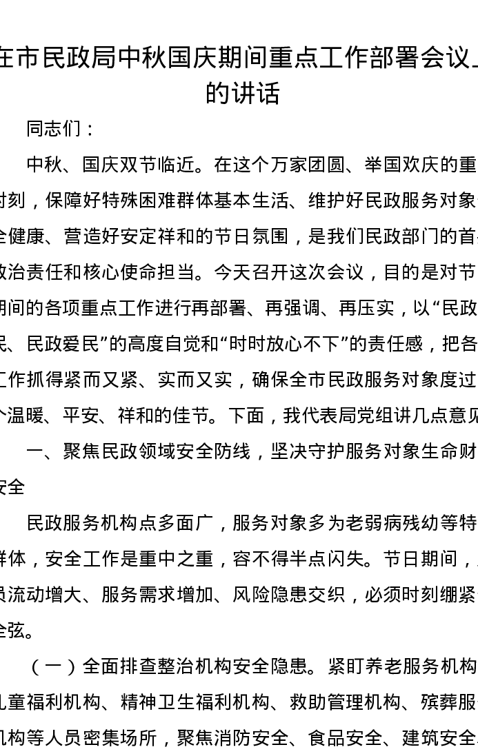 在市民政局中秋国庆期间重点工作部署会议上的讲话