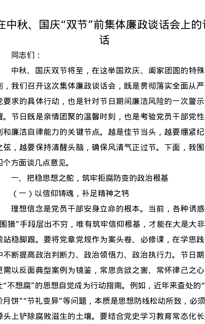 在中秋、国庆“双节”前集体廉政谈话会上的讲话