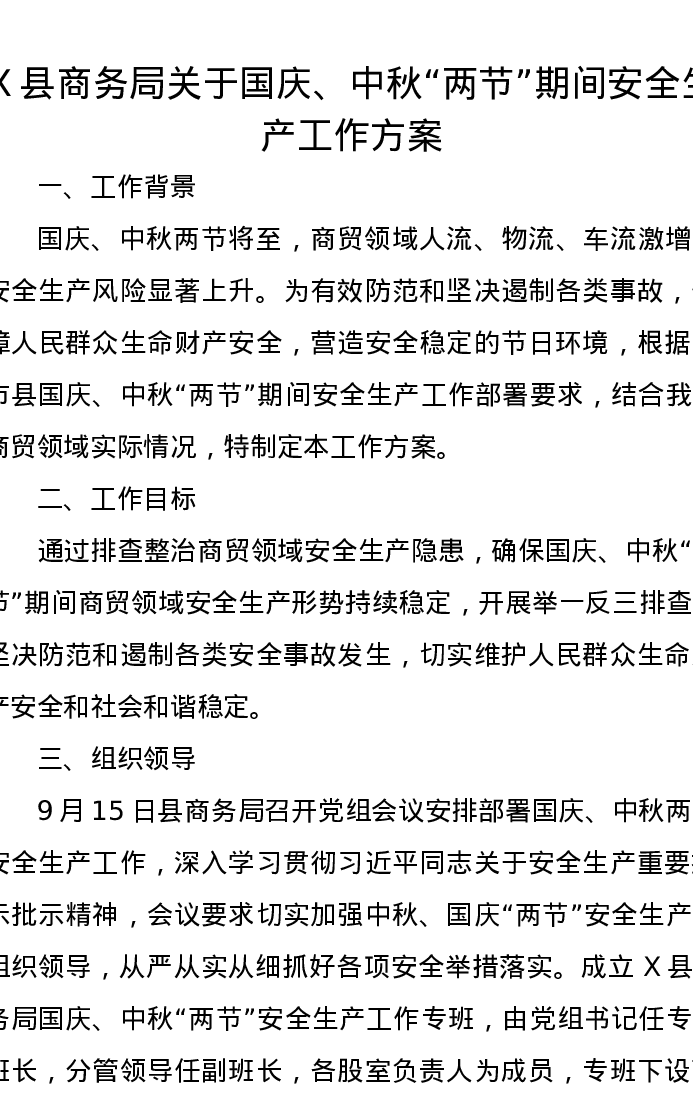 X县商务局关于国庆、中秋“两节”期间安全生产工作方案