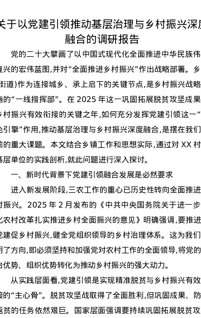 关于以党建引领推动基层治理与乡村振兴深度融合的调研报告