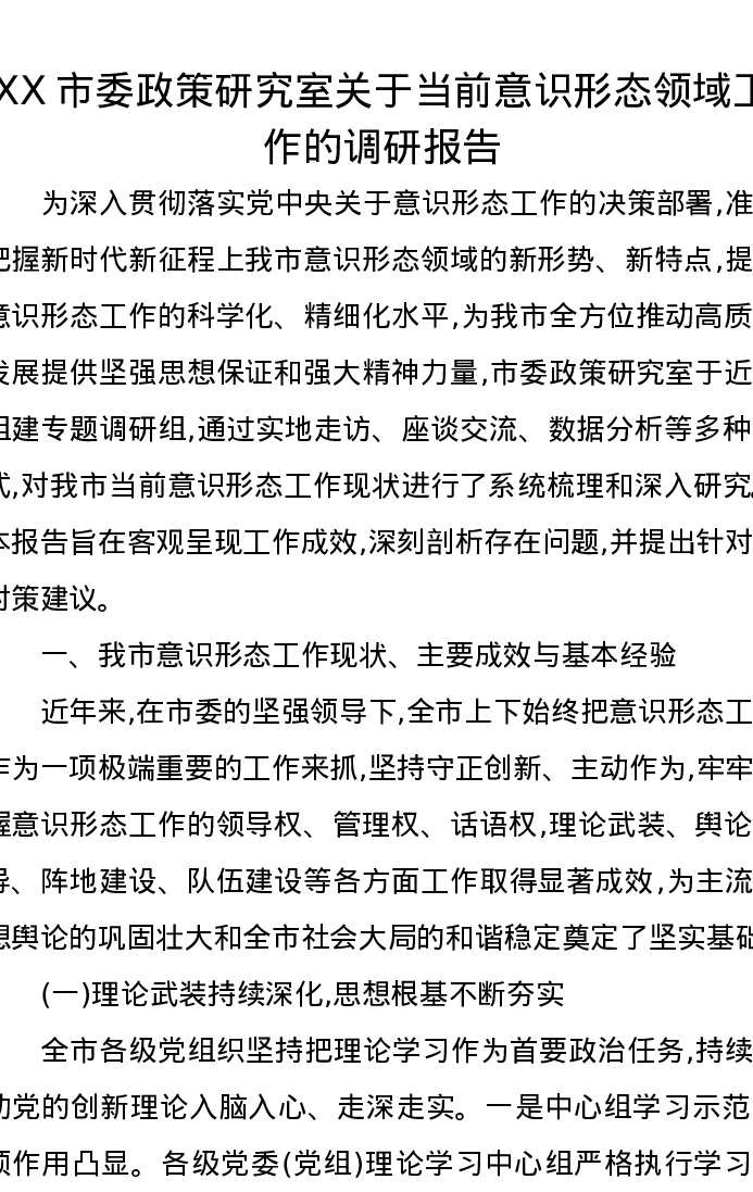 XX市委政策研究室关于当前意识形态领域工作的调研报告