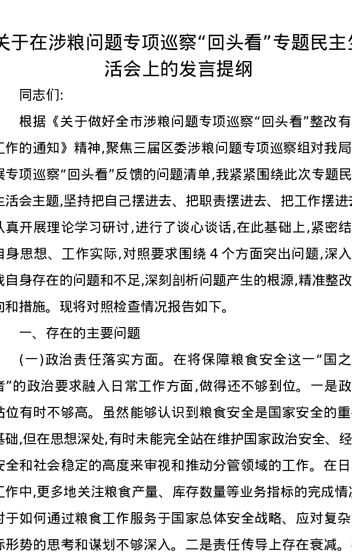 关于在涉粮问题专项巡察“回头看”专题民主生活会上的发言提纲