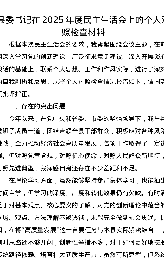 县委书记在2025年度民主生活会上的个人对照检查材料1
