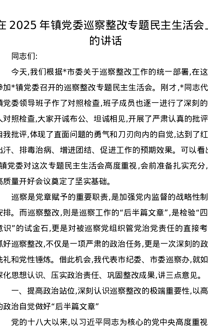 在2025年镇党委巡察整改专题民主生活会上的讲话