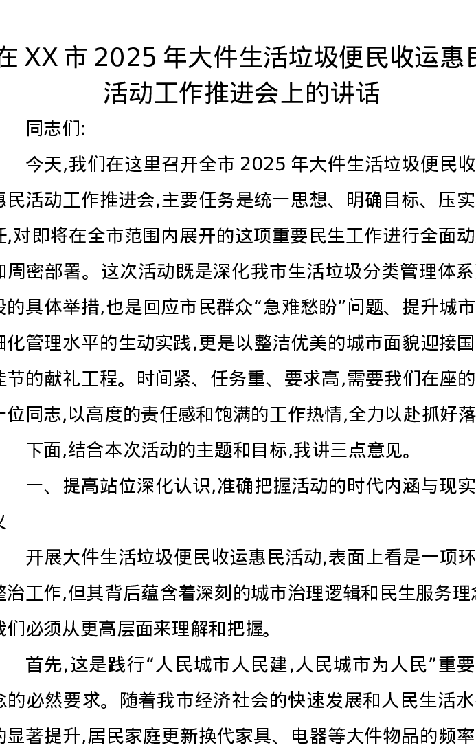 在XX市2025年大件生活垃圾便民收运惠民活动工作推进会上的讲话