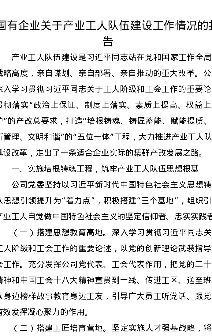 国有企业关于产业工人队伍建设工作情况的报告