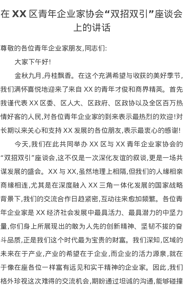 在XX区青年企业家协会“双招双引”座谈会上的讲话