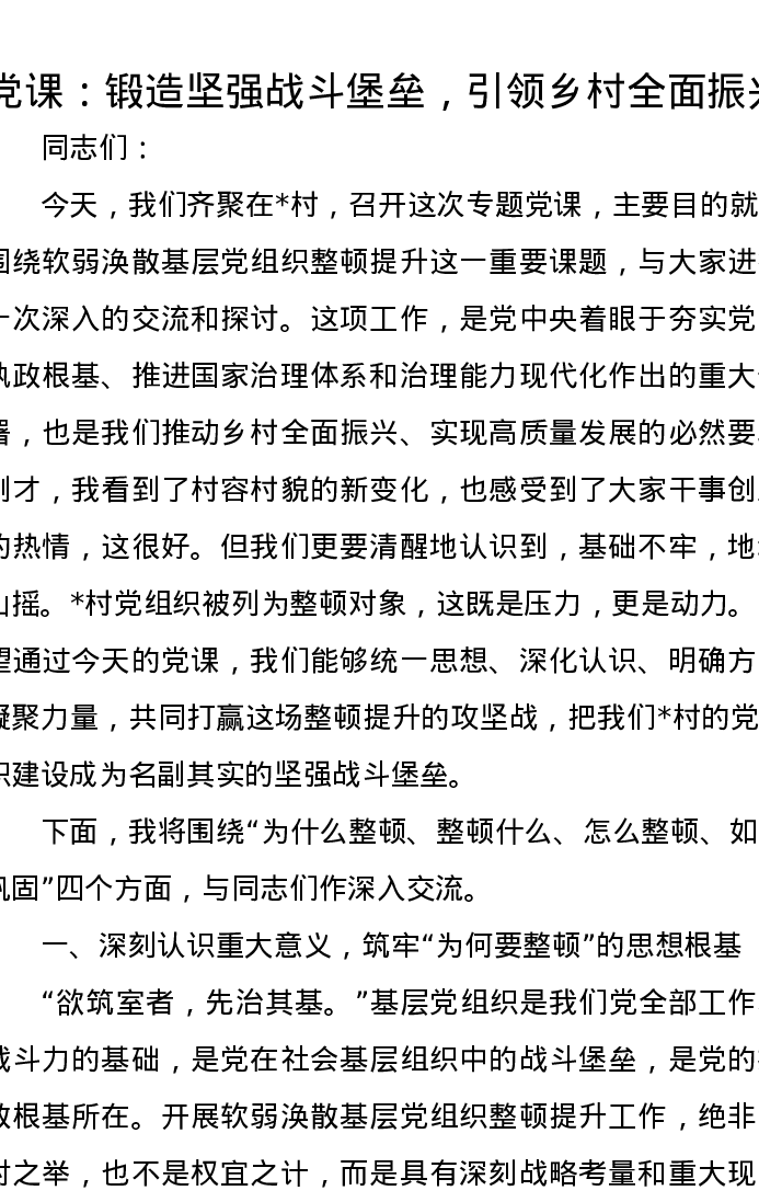 党课讲稿:锻造坚强战斗堡垒,引领乡村全面振兴