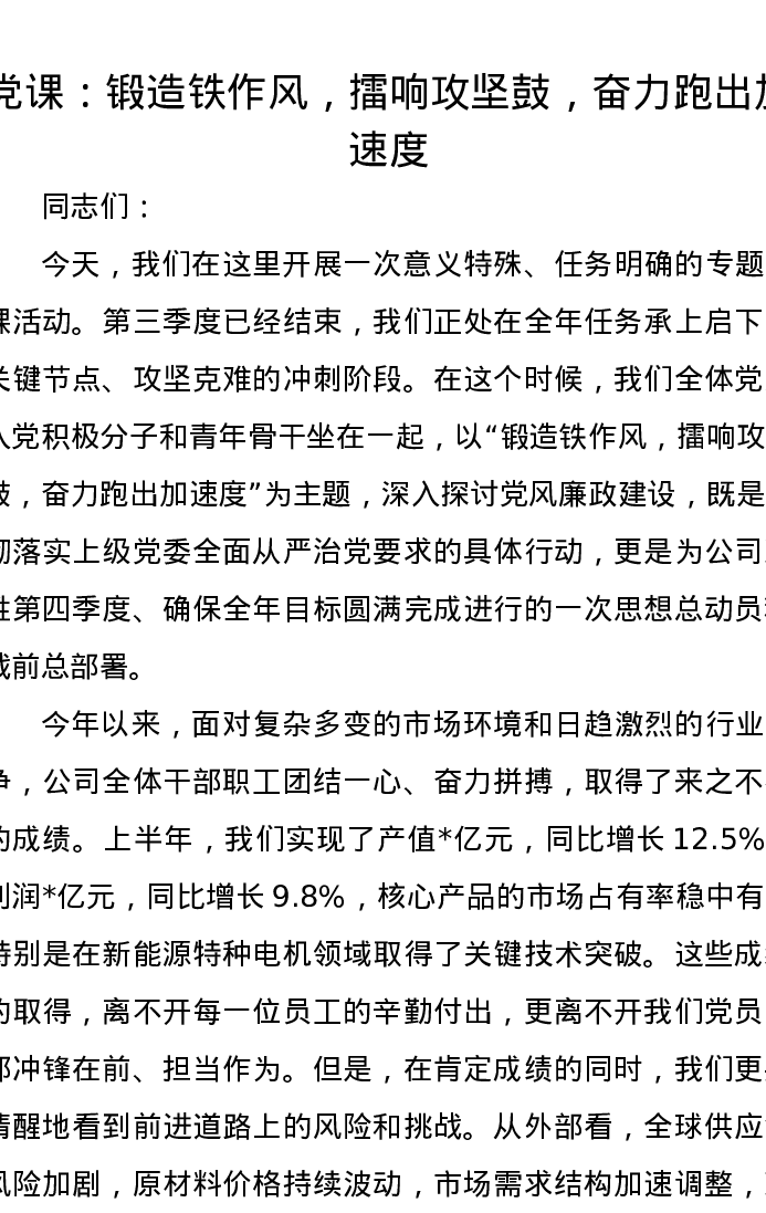 党课讲稿:锻造铁作风,擂响攻坚鼓,奋力跑出加速度