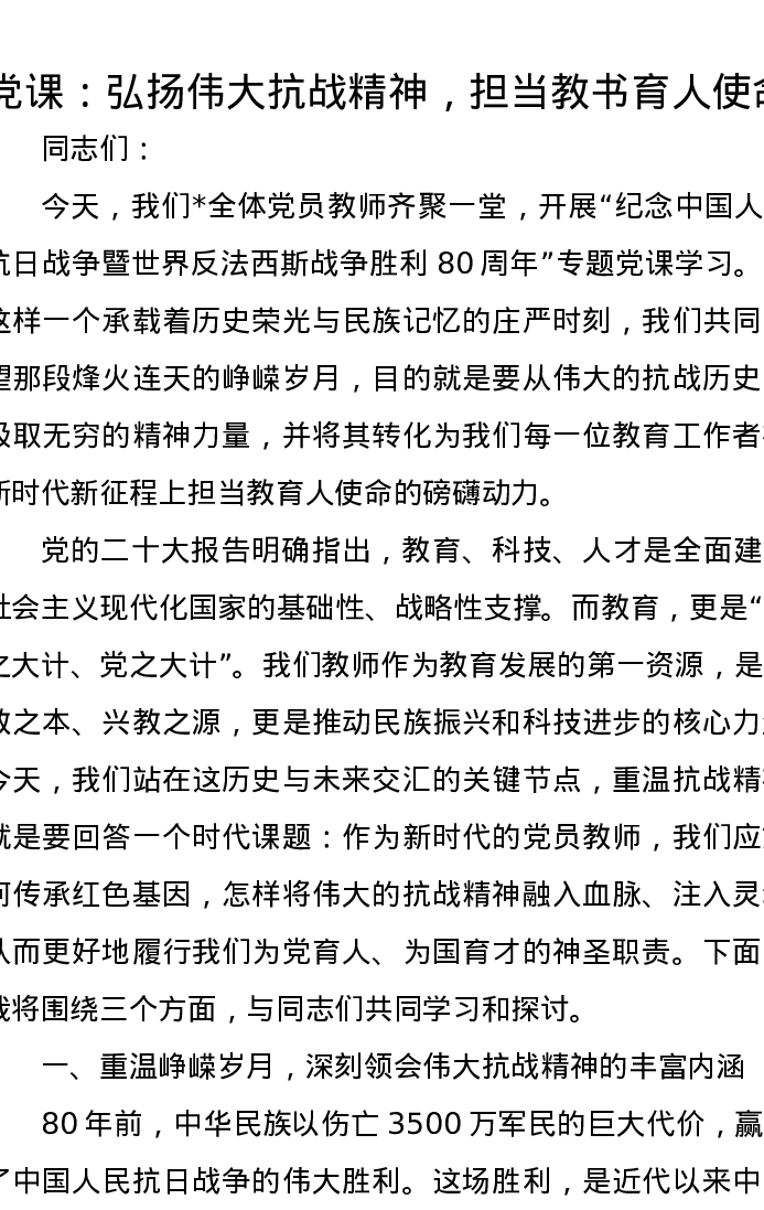 党课讲稿:弘扬伟大抗战精神,担当教书育人使命