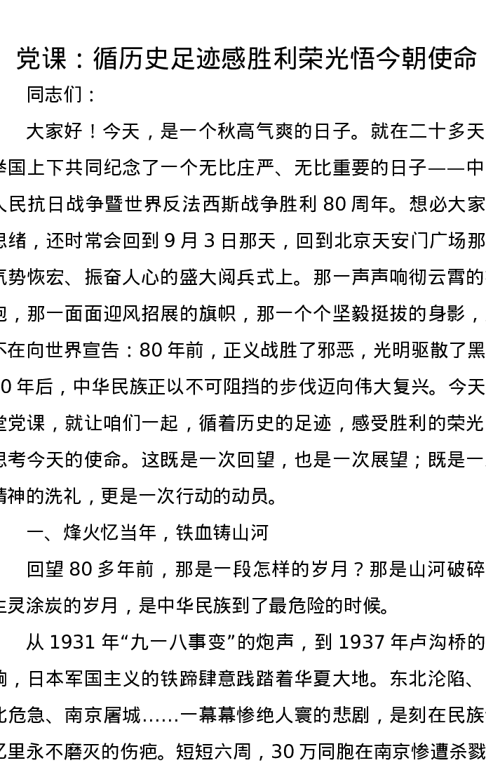 党课讲稿:循历史足迹 感胜利荣光 悟今朝使命