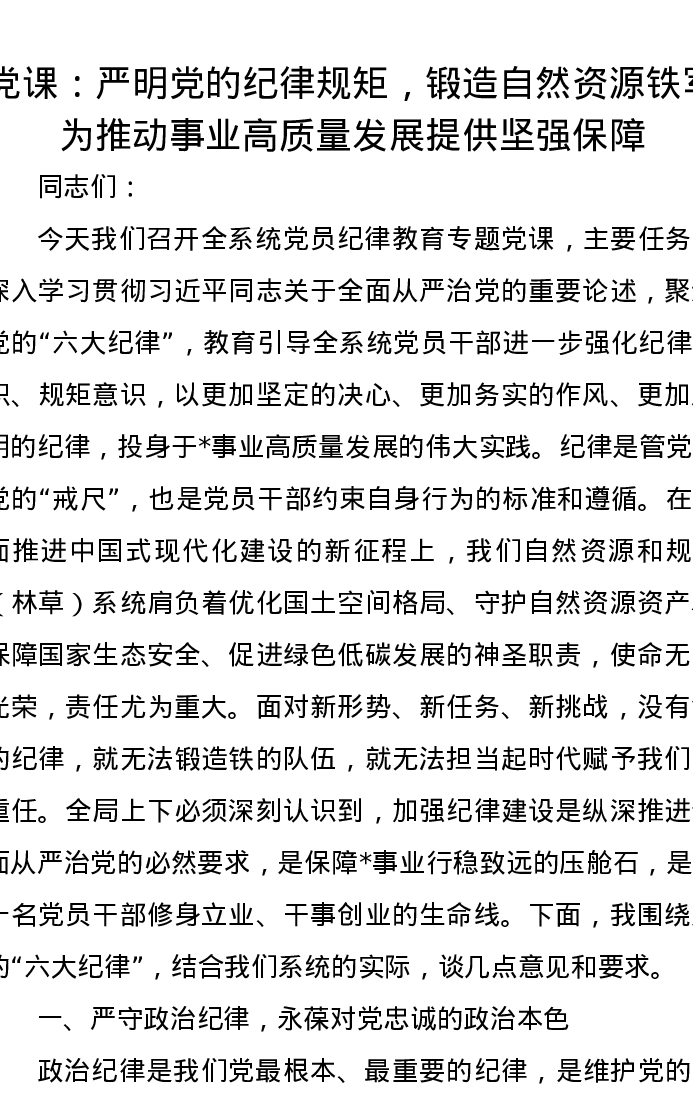 党课讲稿:严明党的纪律规矩,锻造自然资源铁军,为推动事业高质量发展提供坚强保障