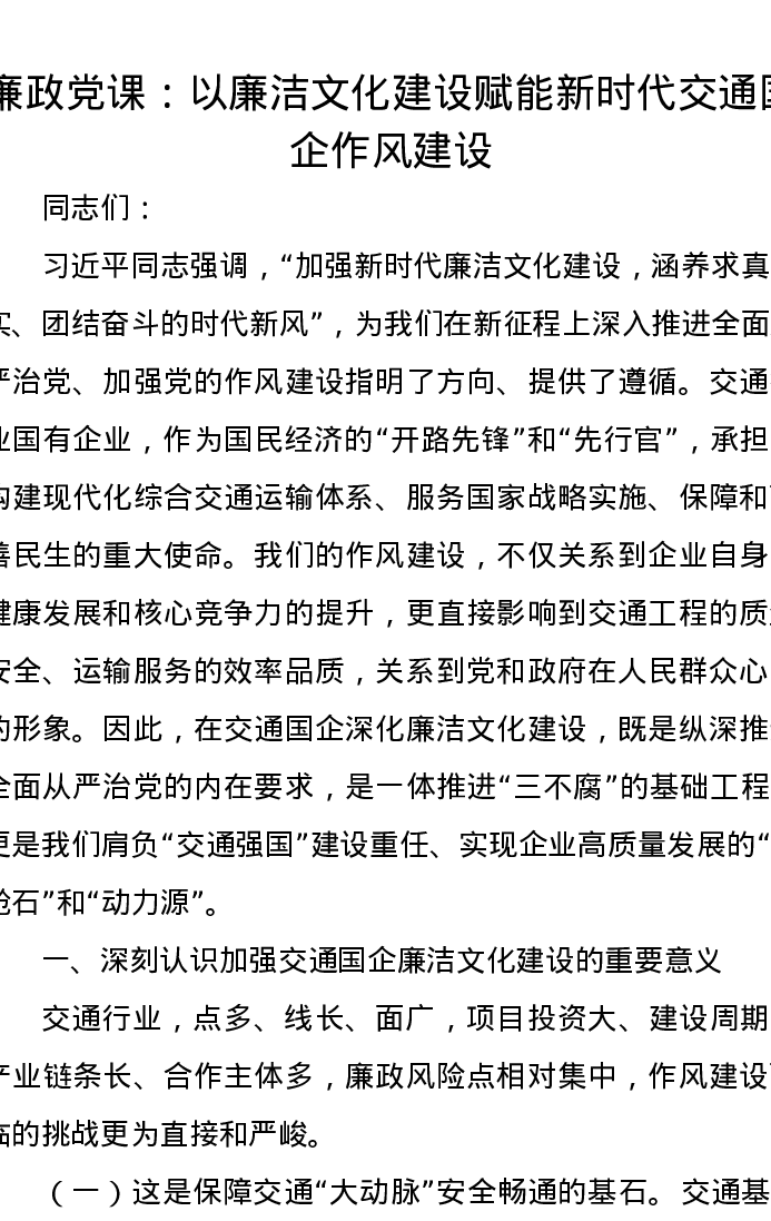 廉政党课讲稿:以廉洁文化建设赋能新时代交通国企作风建设