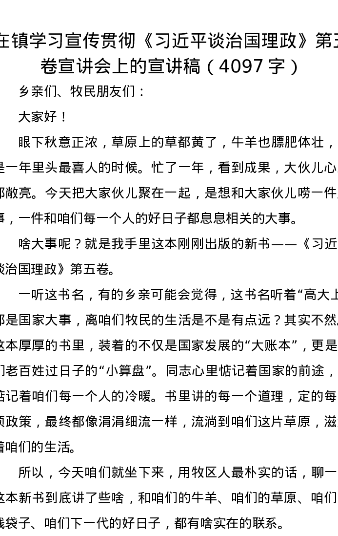在镇学习宣传贯彻《习近平谈治国理政》第五卷宣讲会上的宣讲稿(4097字)