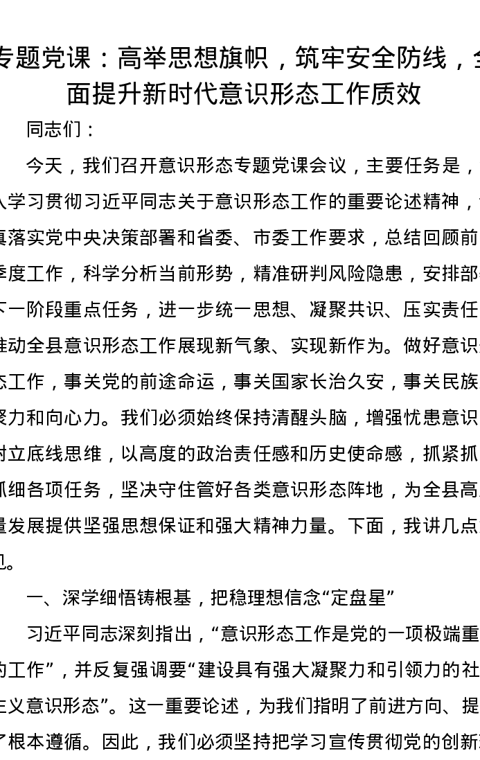 专题党课讲稿:高举思想旗帜,筑牢安全防线,全面提升新时代意识形态工作质效