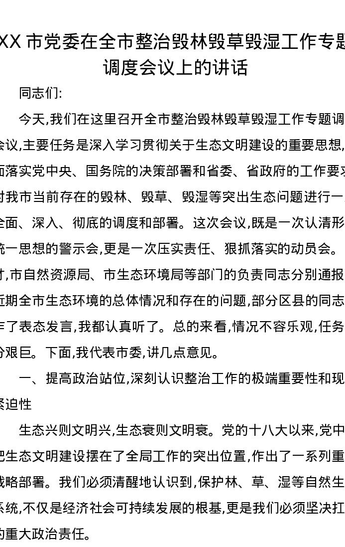 XX市党委在全市整治毁林毁草毁湿工作专题调度会议上的讲话