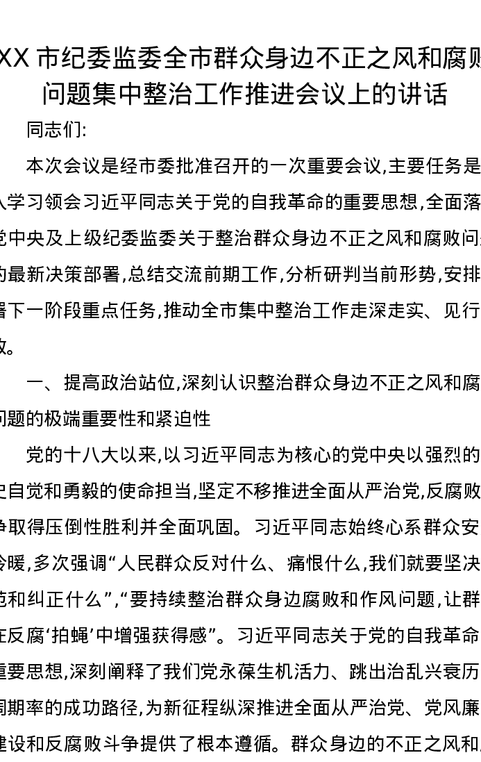 XX市纪委监委全市群众身边不正之风和腐败问题集中整治工作推进会议上的讲话