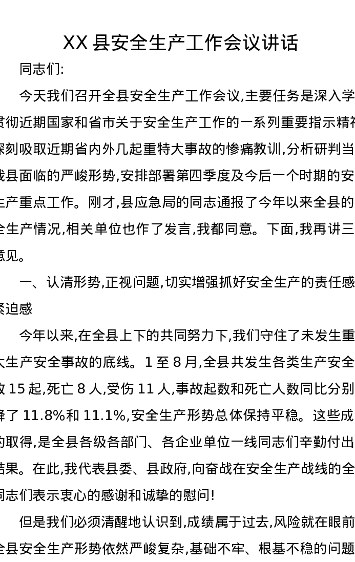 XX县安全生产工作会议讲话