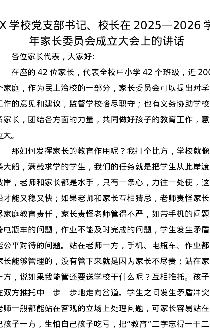 X学校党支部书记、校长在2025—2026学年家长委员会成立大会上的讲话