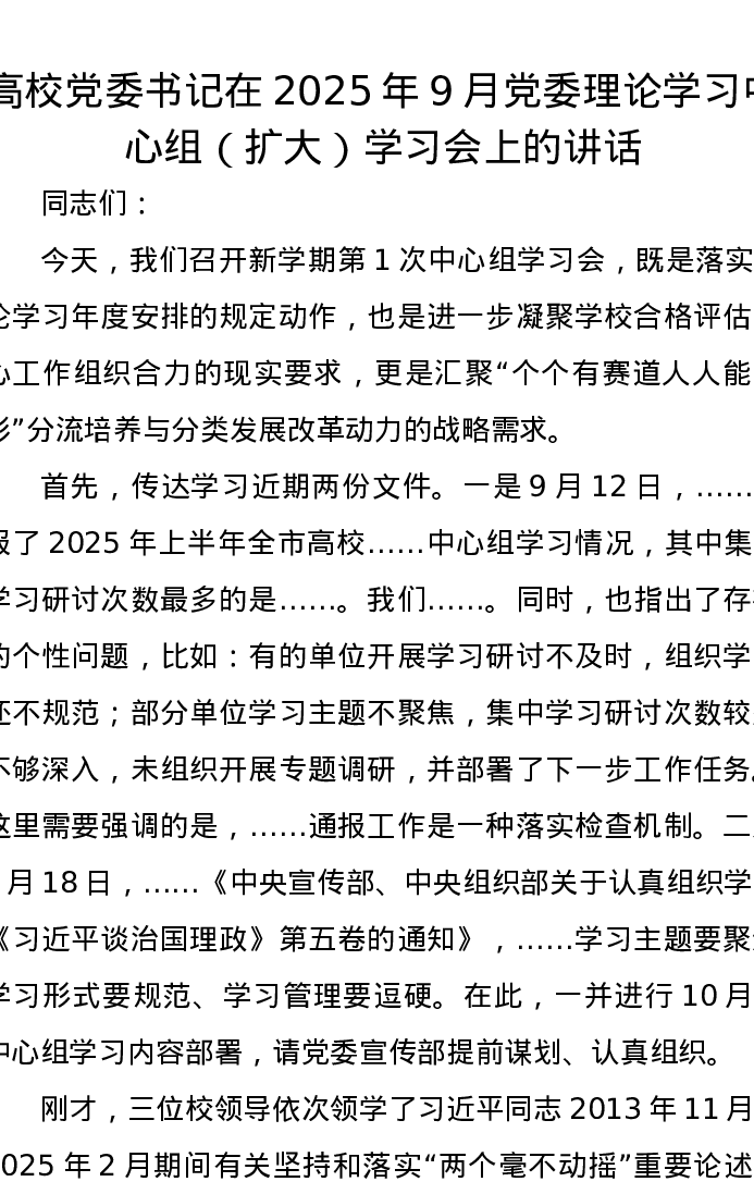 高校党委书记在2025年9月党委理论学习中心组(扩大)学习会上的讲话