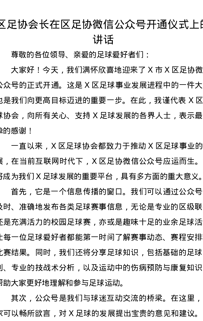 区足协会长在区足协微信公众号开通仪式上的讲话