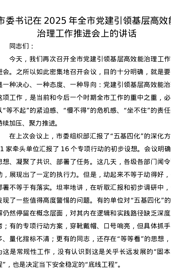 市委书记在2025年全市党建引领基层高效能治理工作推进会上的讲话