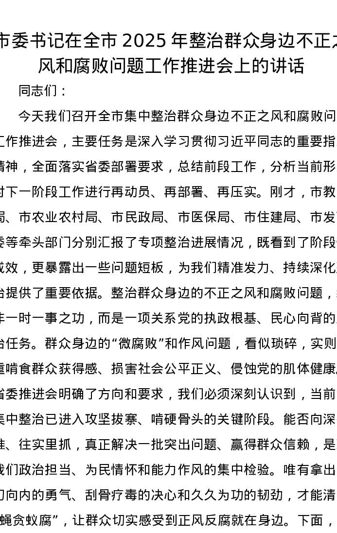 市委书记在全市2025年整治群众身边不正之风和腐败问题工作推进会上的讲话