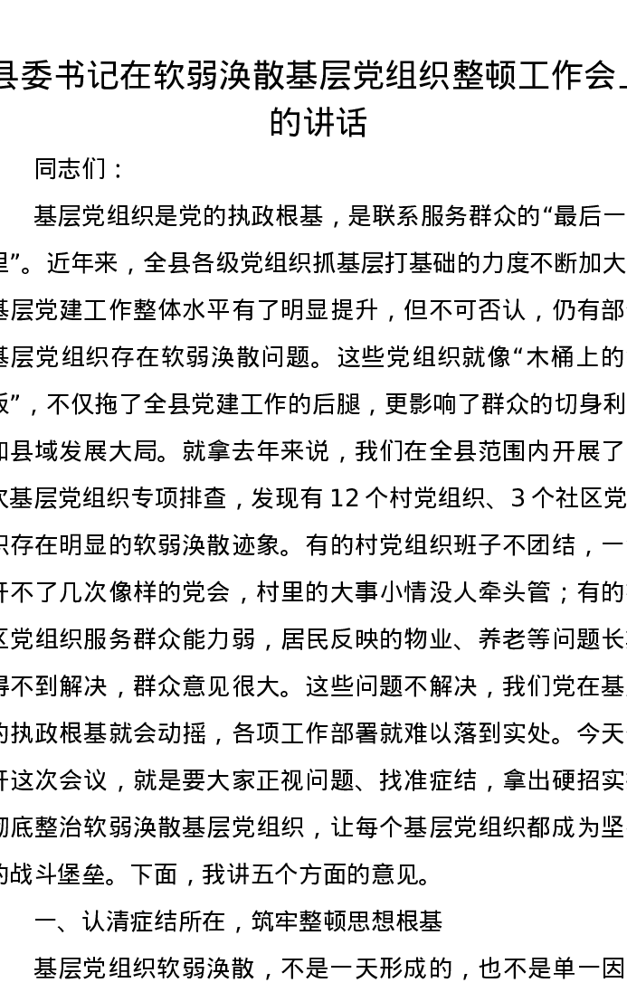 县委书记在软弱涣散基层党组织整顿工作会上的讲话