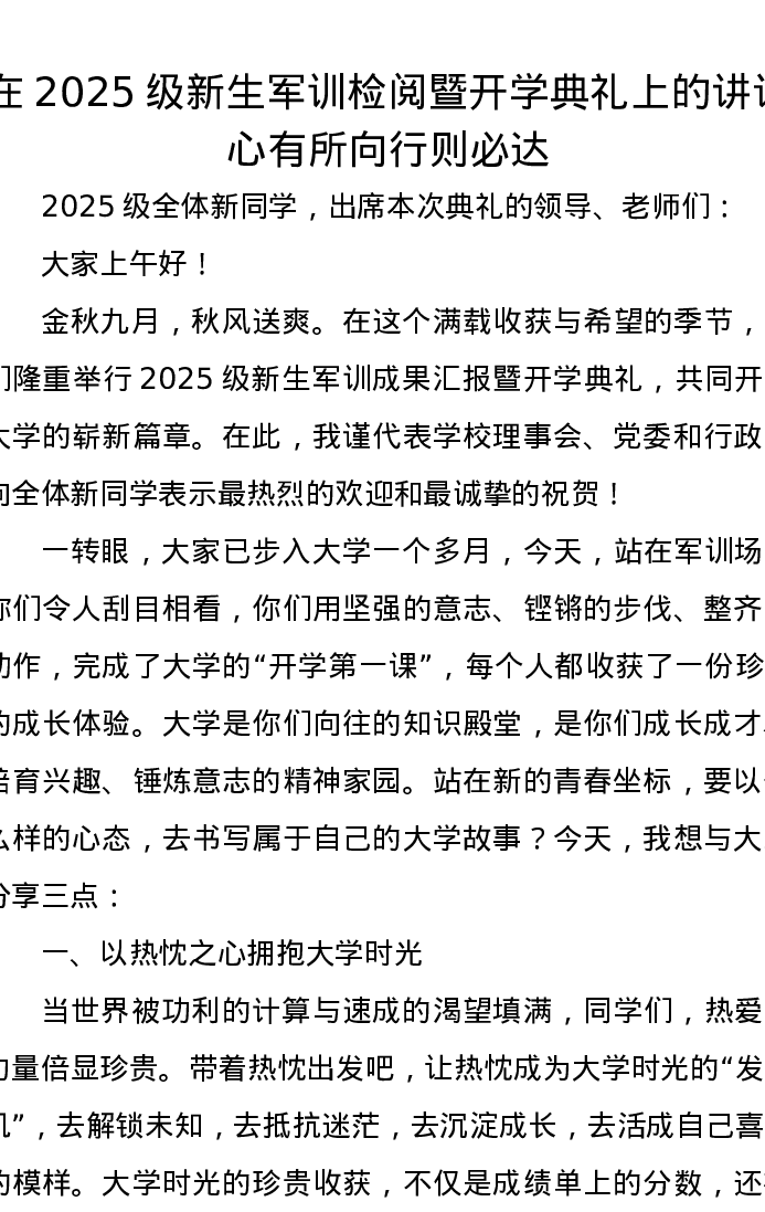 在2025级新生军训检阅暨开学典礼上的讲话:心有所向行则必达