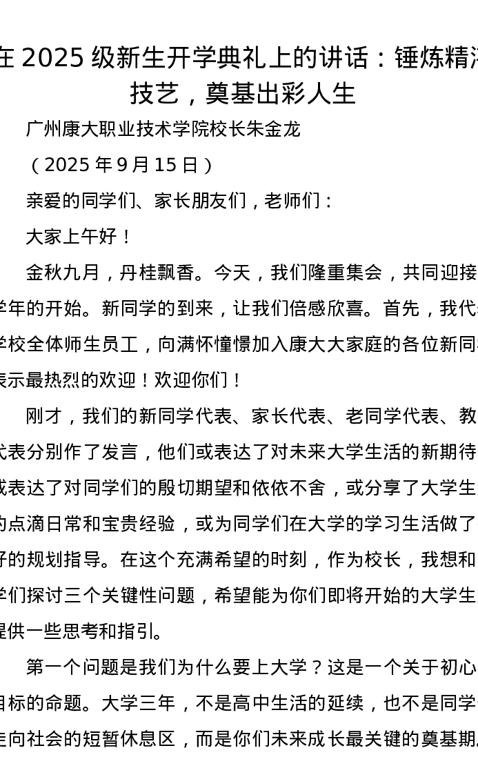 在2025级新生开学典礼上的讲话:锤炼精湛技艺,奠基出彩人生