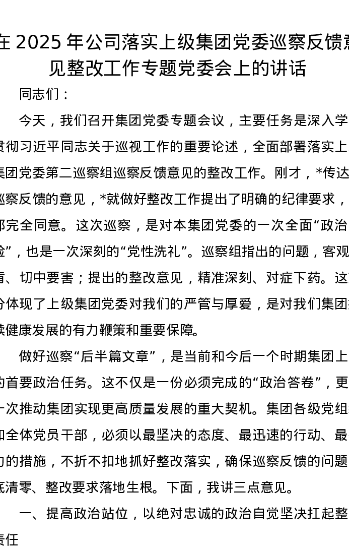 在2025年公司落实上级集团党委巡察反馈意见整改工作专题党委会上的讲话