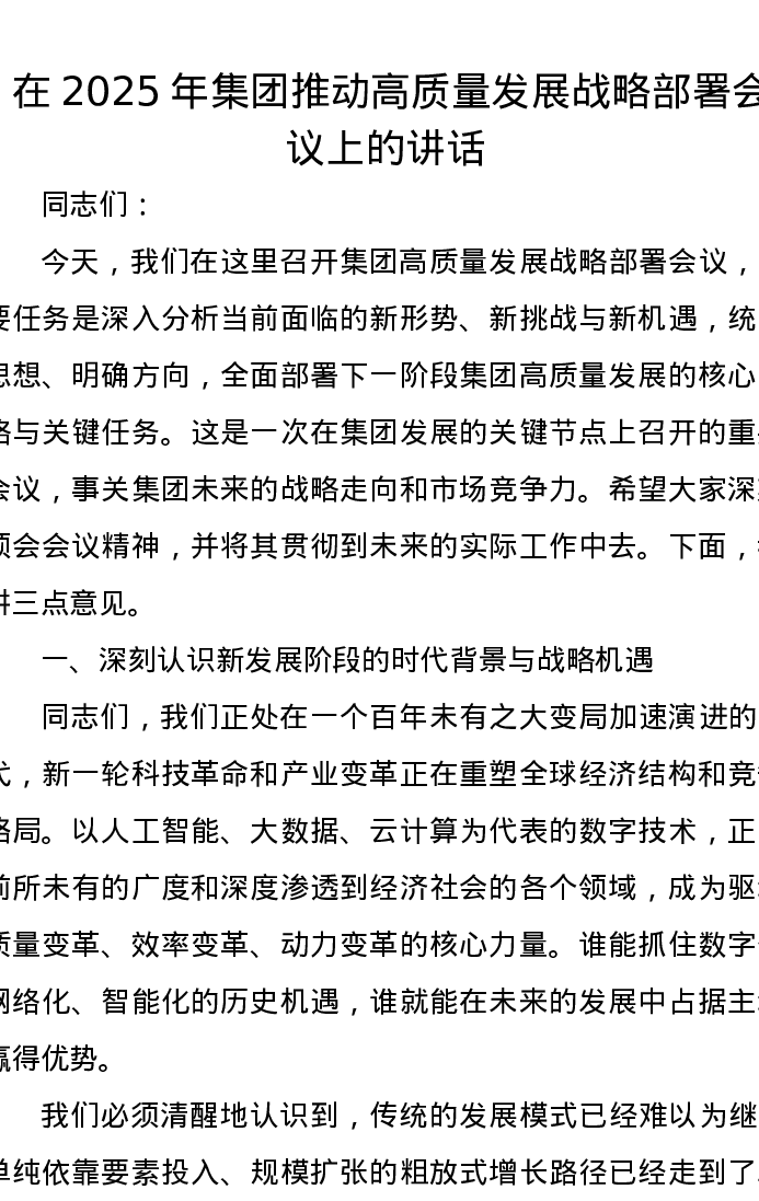 在2025年集团推动高质量发展战略部署会议上的讲话