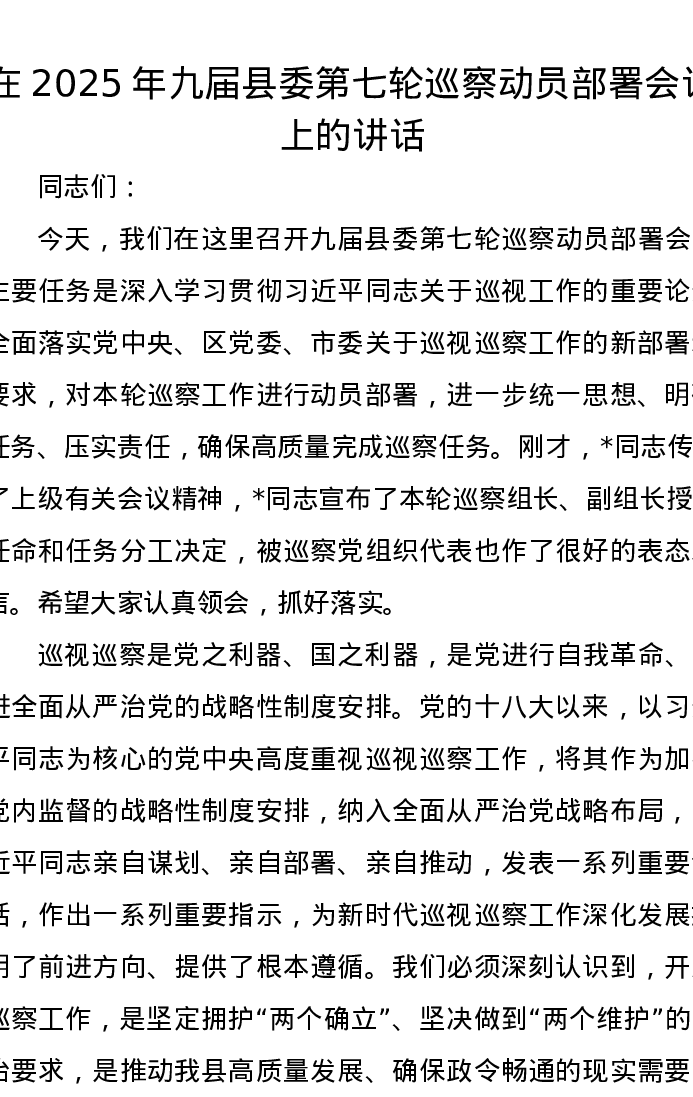 在2025年九届县委第七轮巡察动员部署会议上的讲话