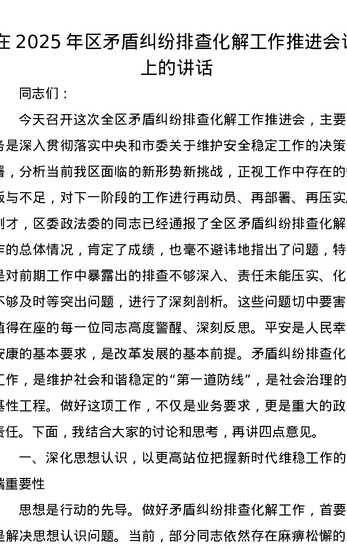 在2025年区矛盾纠纷排查化解工作推进会议上的讲话