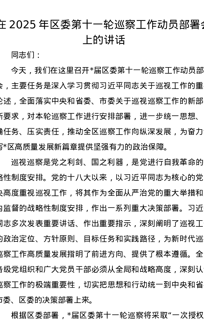 在2025年区委第十一轮巡察工作动员部署会上的讲话