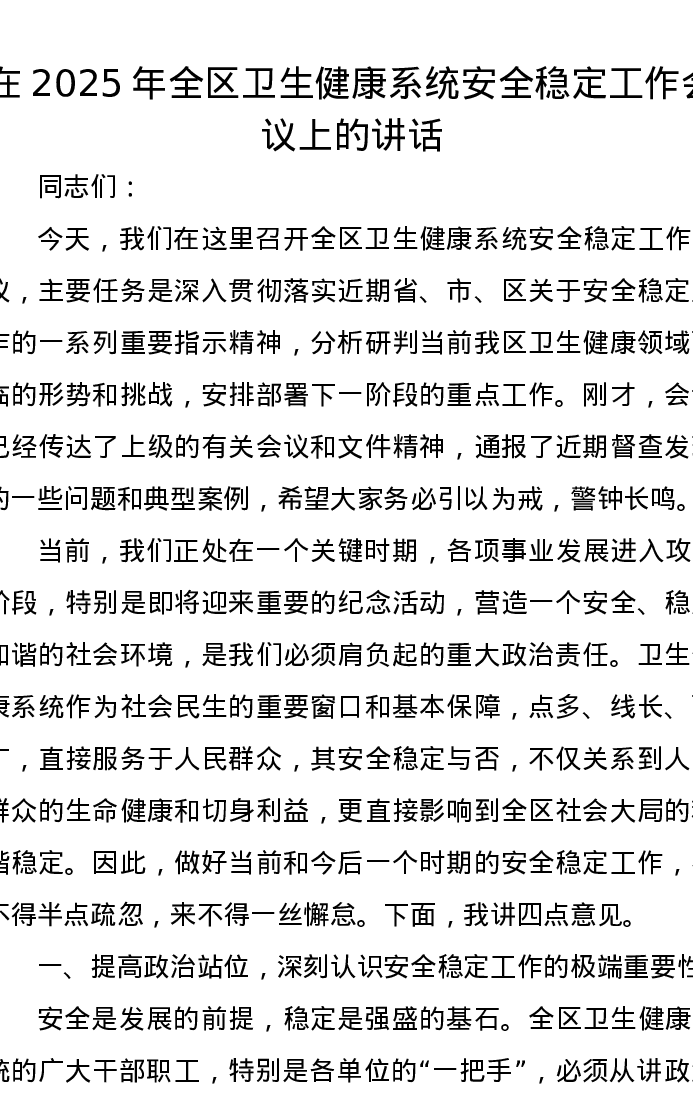 在2025年全区卫生健康系统安全稳定工作会议上的讲话