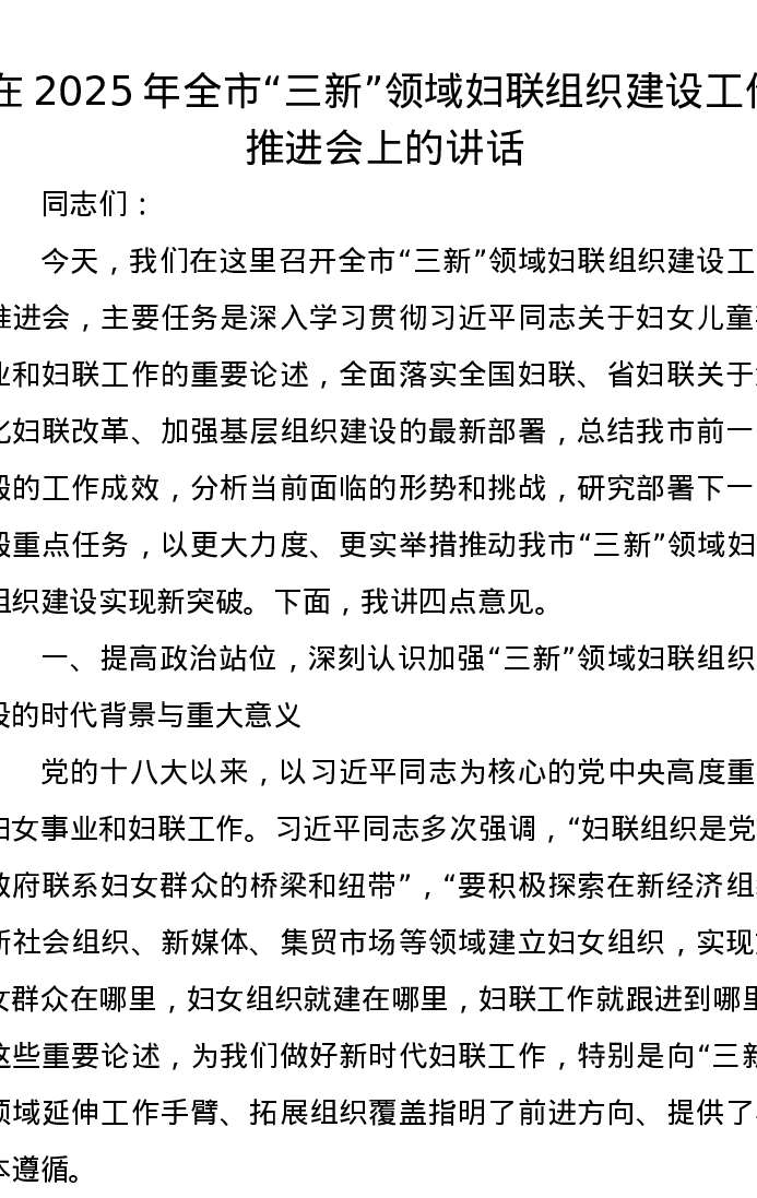 在2025年全市“三新”领域妇联组织建设工作推进会上的讲话