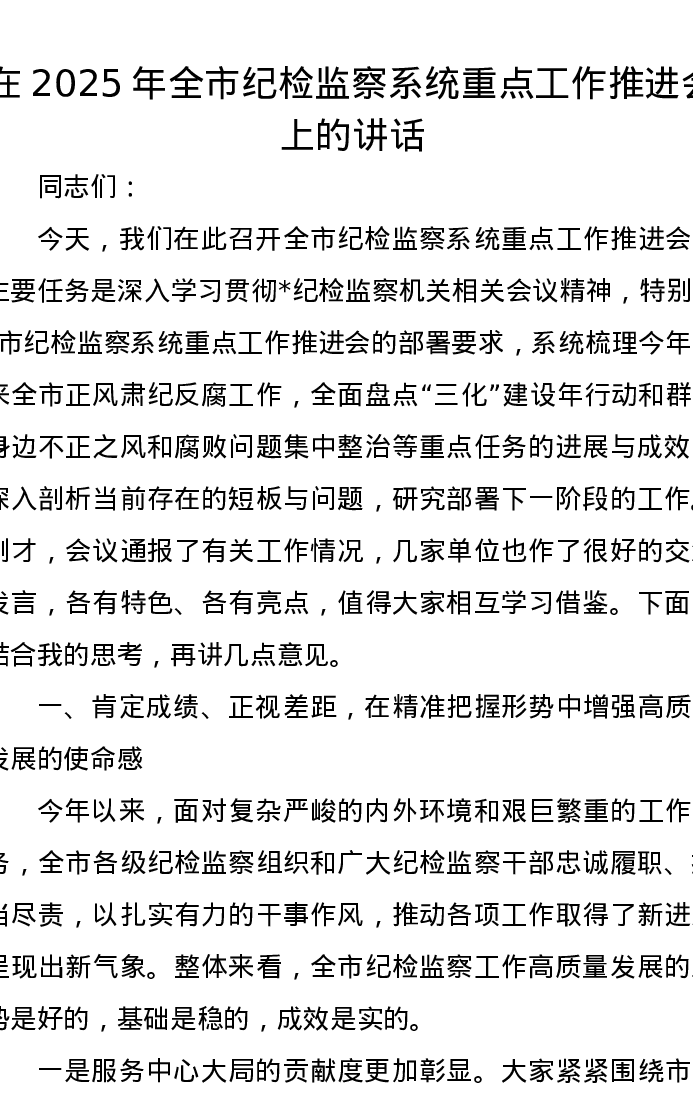 在2025年全市纪检监察系统重点工作推进会上的讲话