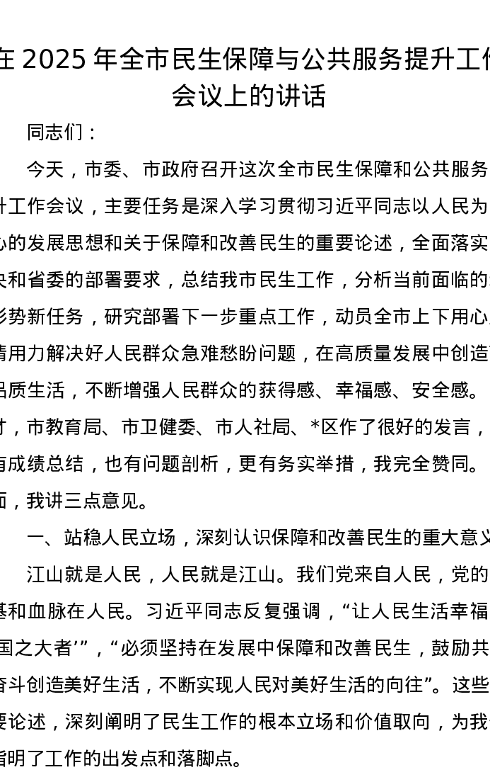 在2025年全市民生保障与公共服务提升工作会议上的讲话