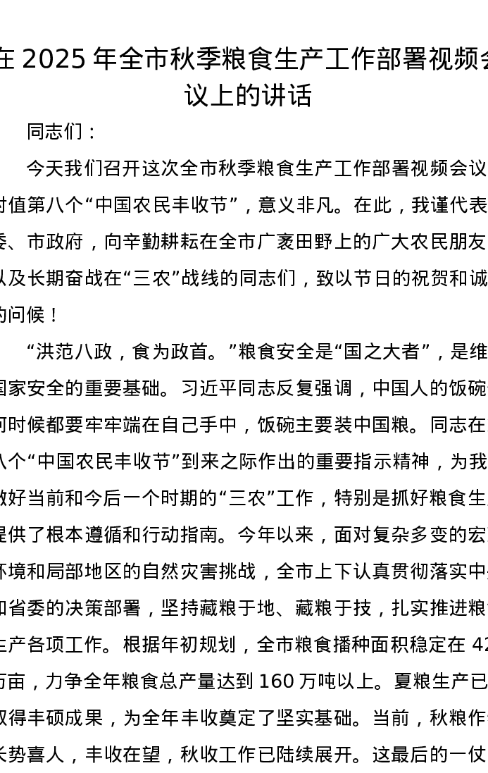 在2025年全市秋季粮食生产工作部署视频会议上的讲话