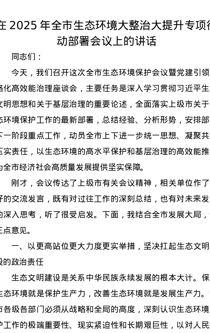 在2025年全市生态环境大整治大提升专项行动部署会议上的讲话