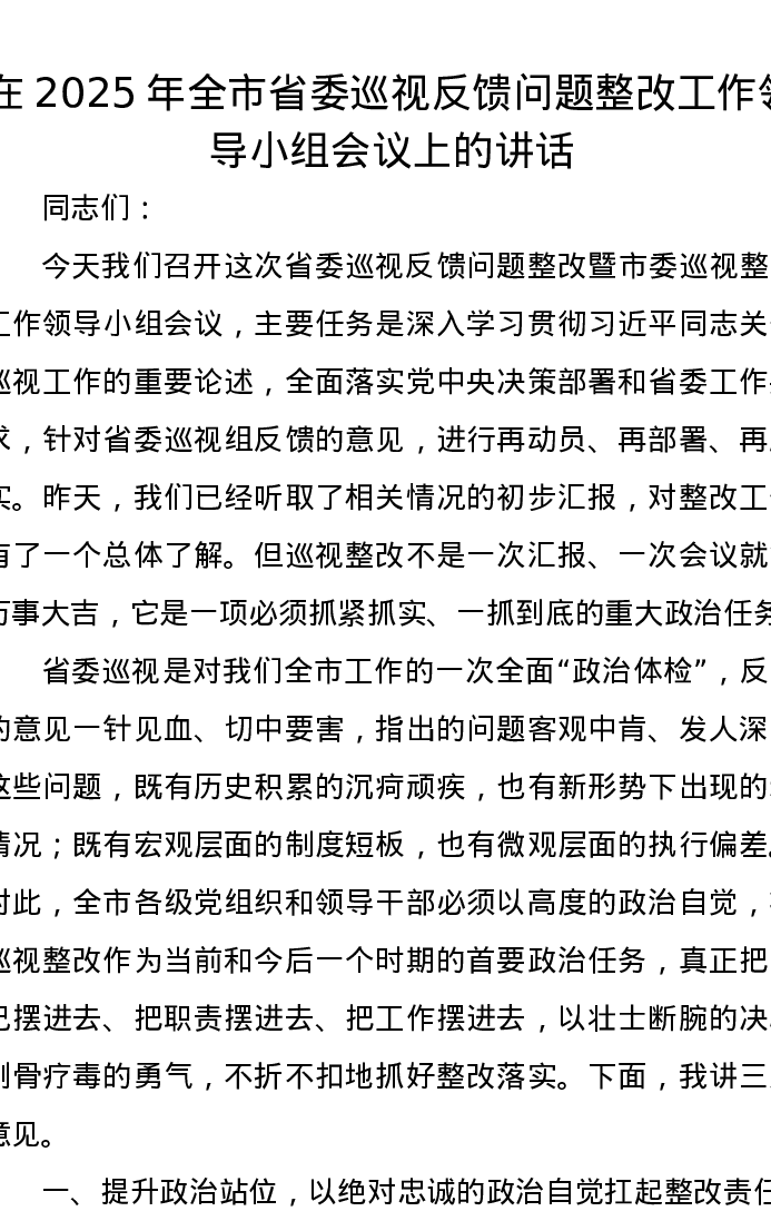 在2025年全市省委巡视反馈问题整改工作领导小组会议上的讲话