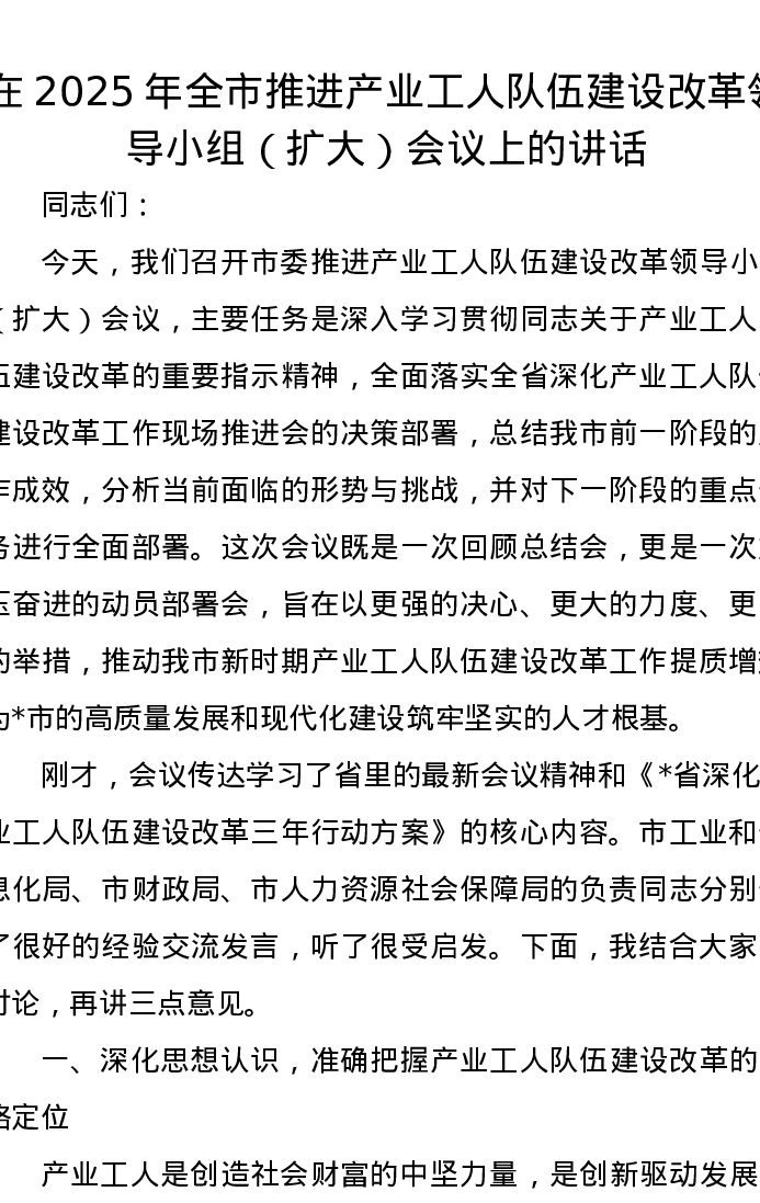 在2025年全市推进产业工人队伍建设改革领导小组(扩大)会议上的讲话