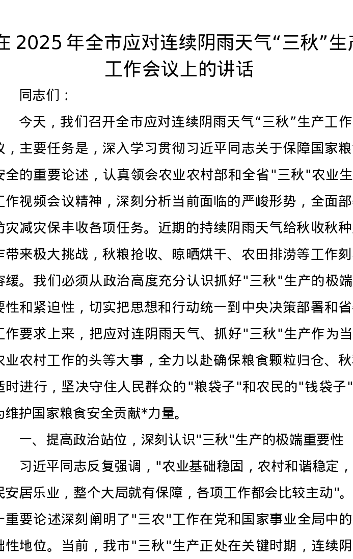 在2025年全市应对连续阴雨天气“三秋”生产工作会议上的讲话
