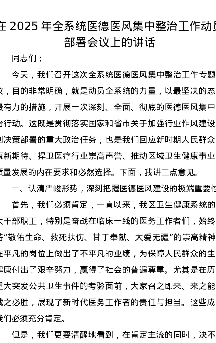 在2025年全系统医德医风集中整治工作动员部署会议上的讲话