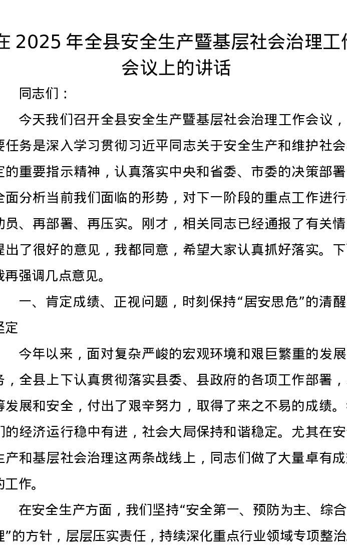 在2025年全县安全生产暨基层社会治理工作会议上的讲话