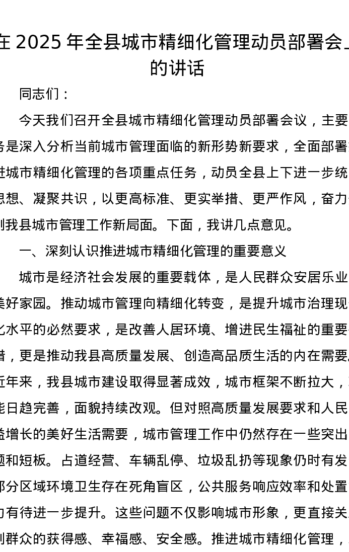 在2025年全县城市精细化管理动员部署会上的讲话